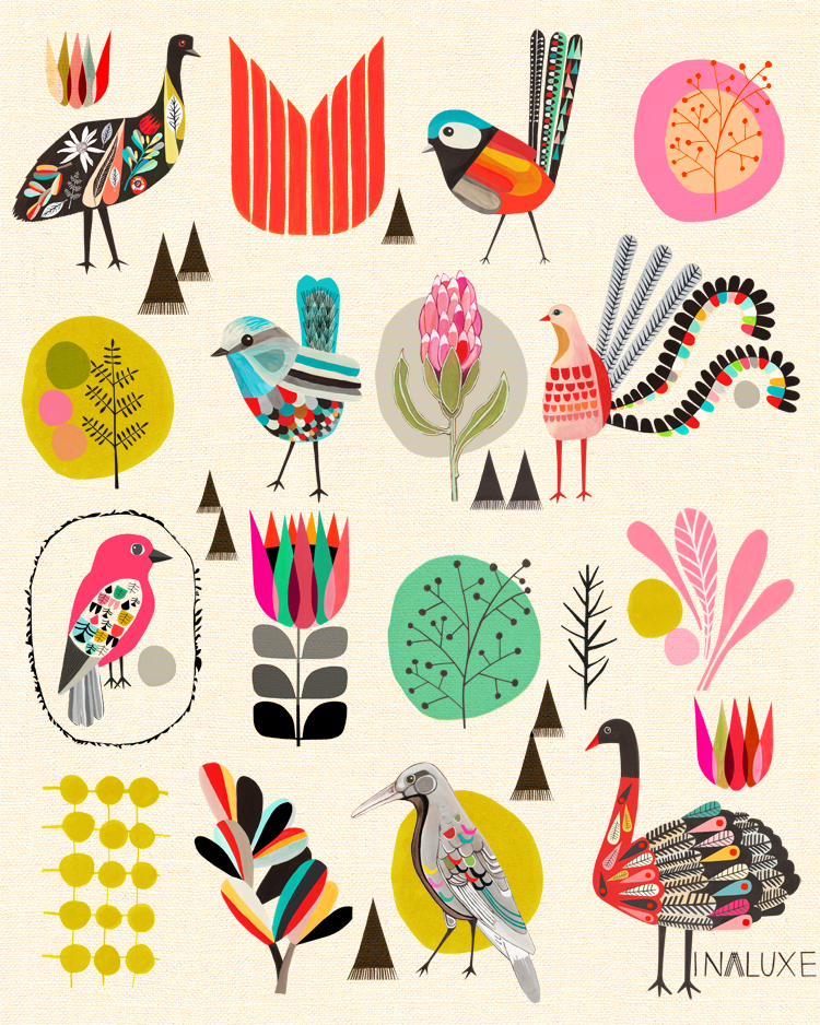 To coincide with the wrapping paper we designed for Earth Greetings, we have put together a little ensemble of some of our favourite Australian birds in a piece aptly titled Birds of Australia. Included here you'll find a Dwarf Emu (sadly extinct) Red Winged Fairy Wren, Superb Blue Wren, the Superb Lyrebird, Laughing Kookaburra, Grey Currawong, and last but not least, the Black Swan. All native to Australia! All of these birds were created exclusively for Earth Greetings, and this design is directly related to the Garden Party wrapping paper that has just come out. This design is currently available as an archival print in our store. I love those little mountains!