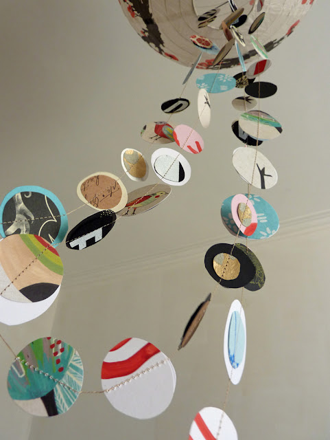 In all my years of sewing, I've never made a garland. It's unbelievable when you think about how amazing they are, what fun they are to put together, and how exciting it is seeing it all come to life. So anyway... I was tidying up today and found a little paper box, whose contents turned out to be bits of paper, and fabric I started saving a few years ago. So in an effort to reduce the amount of "Stuff" I hang onto, I decided to give the garland a whirl, and well... it was fun, very relaxing, and for a little while I didn't think about anything but cutting paper, and sewing. Lovely. Here it is hanging from our shade in the bedroom. Final destination unknown, but I think I am going to like waking up in the morning and just looking at it for a while.